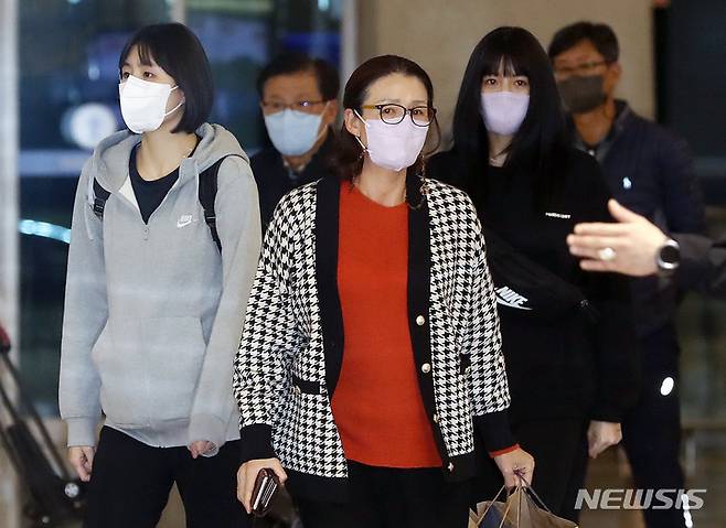 [인천공항=뉴시스] 홍효식 기자 = 학교폭력과 가정폭력 의혹에 휩싸인 이재영(왼쪽), 이다영 쌍둥이 자매가 16일 오후 인천국제공항을 통해 그리스로 출국하고 있다. 이들은 지난 9일 개막한 2021-22 시즌 그리스 리그 PAOK 테살로니키 구단에 합류한다. 가운데는 어머니 김경희 씨. 2021.10.16. yesphoto@newsis.com