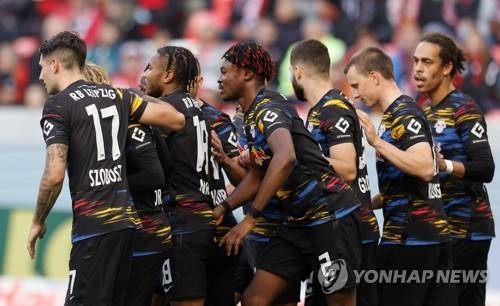 epa09527035 Leipzig players celebrate after scoring the opening goal by penalty during the German Bundesliga soccer match between SC Freiburg and RB Leipzig in Freiburg, Germany, 16 October 2021. EPA/RONALD WITTEK CONDITIONS - ATTENTION: The DFL regulations prohibit any use of photographs as image sequences and/or quasi-video.