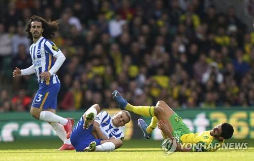 Brighton and Hove Albion's Leandro Trossard, centre, and Norwich City's Pierre Lees-Melou collide, during theEnglish Premier League soccer match between Norwich and Brighton and Hove Albion, at Carrow Road, in Norwich, England, Saturday, Oct. 16, 2021. (Joe Giddens/PA via AP) UNITED KINGDOM OUT NO SALES NO ARCHIVE PHOTOGRAPH CANNOT BE STORED OR USED FOR MORE THAN 14 DAYS AFTER THE DAY OF TRANSMISSION