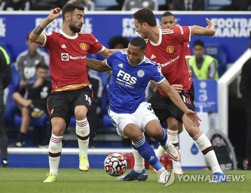 Leicester's Youri Tielemans, centre, challenges for the ball with Manchester United's Bruno Fernandes, left, and Manchester United's Nemanja Matic during the English Premier League soccer match between Leicester City and Manchester United at King Power stadium in Leicester, England, Saturday, Oct. 16, 2021. (AP Photo/Rui Vieira)
