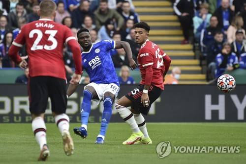 Leicester's Daniel Amartey, centre, kicks the ball ahead of Manchester United's Jadon Sancho, right, during the English Premier League soccer match between Leicester City and Manchester United at King Power stadium in Leicester, England, Saturday, Oct. 16, 2021. (AP Photo/Rui Vieira)