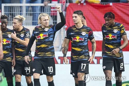 Leipzig's Emil Forsberg, center, celebrates after scoring his side's opening goal besides teammates Amadou Haidara, from left, Kevin Kampl, Dominik Szoboszlai and Mohamed Simakan during the German Bundesliga soccer match between SC Freiburg and RB Leipzig in Freiburg, Germany, Saturday, Oct. 16, 2021. (Tom Weller/dpa via AP) THE DEUTSCHE FUSSBALL LIGA DFL DOES NOT ALLOW THE IMAGES TO BE USED AS SEQUENCES TO EMULATE VIDEO.