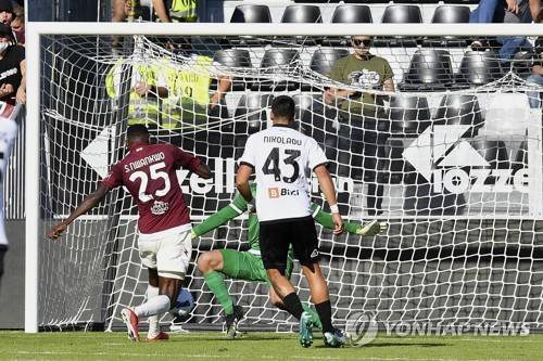 Salernitana's Simy, left, scores his side's opening goal, during the Serie A soccer match between Spezia and Salernitana, at the Armando Picco stadium in La Spezia, Italy, Saturday, Oct. 16, 2021. (Tano Pecoraro/LaPresse via AP) ITALY OUT;