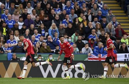 epa09527120 Mason Greenwood (L) of Manchester United celebrates with teammates Jadon Sancho (C) and Bruno Fernandes (R) after scoring the 1-0 lead during the English Premier League match between Leicester City and Manchester United in Leicester, Britain, 16 October 2021. EPA/NEIL HALL EDITORIAL USE ONLY. No use with unauthorized audio, video, data, fixture lists, club/league logos or 'live' services. Online in-match use limited to 120 images, no video emulation. No use in betting, games or single club/league/player publications