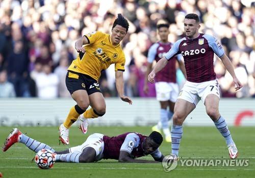 Aston Villa's Axel Tuanzebe, bottom, slides in on Wolverhampton Wanderers' Hwang Hee-chan as Aston Villa's John McGinn looks on, during the English Premier League soccer match between Wolverhampton and Aston Villa, at Villa Park, Birmingham, England, Saturday, Oct. 16, 2021. (Nick Potts/PA via AP) UNITED KINGDOM OUT NO SALES NO ARCHIVE PHOTOGRAPH CANNOT BE STORED OR USED FOR MORE THAN 14 DAYS AFTER THE DAY OF TRANSMISSION