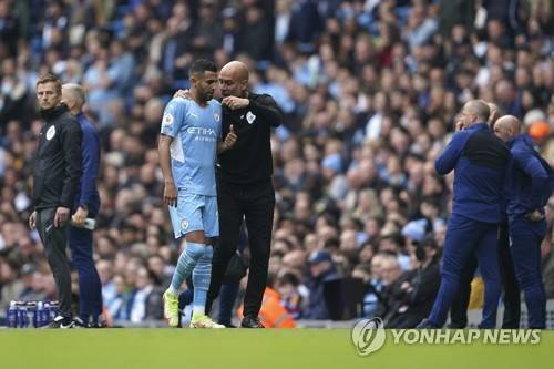 Manchester City's head coach Pep Guardiola, canter right, gives instructions to his player Riyad Mahrez during the English Premier League soccer match between Manchester City and Burnley at Etihad stadium in Manchester, England, Saturday, Oct. 16, 2021. (AP Photo/Jon Super)