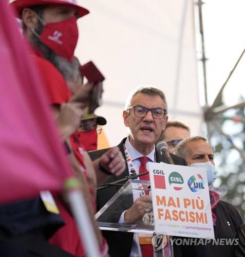 Head of the CGIL union confederation, Maurizio Landini delivers a speech during a march organized by Italy's main labor unions, in Rome's St. John Lateran square, Saturday, Oct. 16, 2021. The march was called a week after protesters, armed with sticks and metal bars, smashed their way into the headquarters of CGIL, a left-leaning union, and trashed its office, during a demonstration to protest a government rule requiring COVID-19 vaccines or negative tests for workers to enter their offices. (AP Photo/Andrew Medichini)