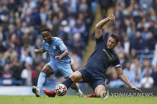 Manchester City's Raheem Sterling, left, fights for the ball with Burnley's James Tarkowski during the English Premier League soccer match between Manchester City and Burnley at Etihad stadium in Manchester, England, Saturday, Oct. 16, 2021. (AP Photo/Jon Super)