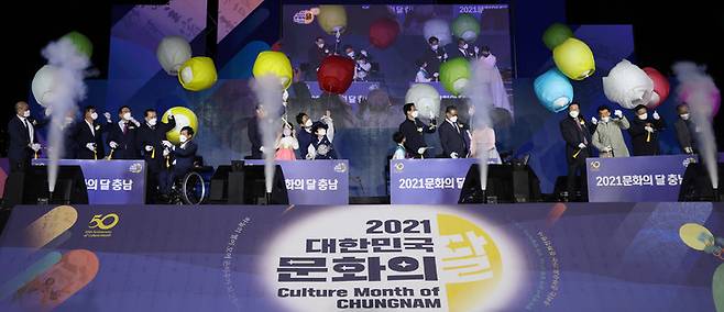 [서울=뉴시스] 홍효식 기자 = 황희 문화체육관광부 장관이 16일 충남 홍성군 내포신도시 홍예공원에서 열린 2021년 문화의 달 기념식에 참석해 어린이와 함께 해·달·별에게 전하는 편지를 묶은 풍등을 날리는 개막 세리머니를 하고 있다. (사진=문화체육관광부 제공) 2021.10.16. photo@newsis.com *재판매 및 DB 금지