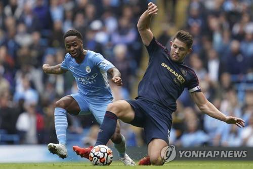 Manchester City's Raheem Sterling, left, fights for the ball with Burnley's James Tarkowski during the English Premier League soccer match between Manchester City and Burnley at Etihad stadium in Manchester, England, Saturday, Oct. 16, 2021. (AP Photo/Jon Super)