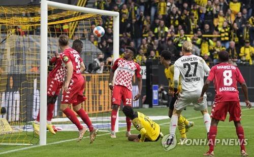 Mainz's Moussa Niakhate saves the ball on the goal line during the German Bundesliga soccer match between Borussia Dortmund and FSV Mainz 05 in Dortmund, Germany, Saturday, Oct. 16, 2021. (AP Photo/Martin Meissner) The deutsche fussball liga dfl does not allow the images to be used as sequences to emulate video.