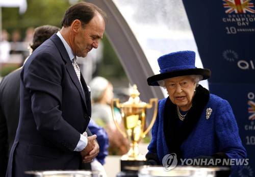 Britain's Queen Elizabeth ahead of presenting the trophy, after the British Champions Fillies & Mares Stakes during the British Champions Day at Ascot Racecourse, in Ascot, England, Saturday, Oct. 16, 2021. (Steven Paston/PA via AP) UNITED KINGDOM OUT NO SALES NO ARCHIVE PHOTOGRAPH CANNOT BE STORED OR USED FOR MORE THAN 14 DAYS AFTER THE DAY OF TRANSMISSION