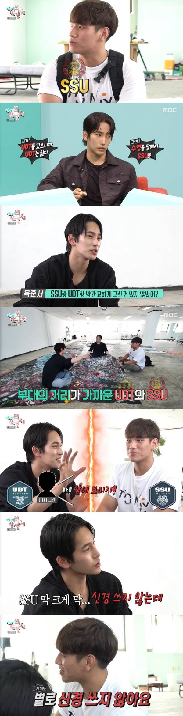 육준서는 "SSU랑 UDT랑 묘하게 그런 거 있지 않아?"라며 "두 부대가 가깝다"며 "단체로 구보를 뛰다가 만나는 지점이 있다"고 했다. 이어 "저희 부대 사람들은 SSU 크게 신경 쓰지 않는다"고 공격했다. 이에 육준희 씨는 "저희 부대도 신경 안 쓴다"고 받아쳤다.