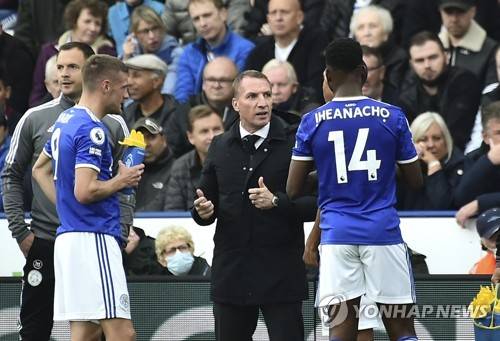 Leicester's manager Brendan Rodgers, centre, talks to players during the English Premier League soccer match between Leicester City and Manchester United at King Power stadium in Leicester, England, Saturday, Oct. 16, 2021. (AP Photo/Rui Vieira)