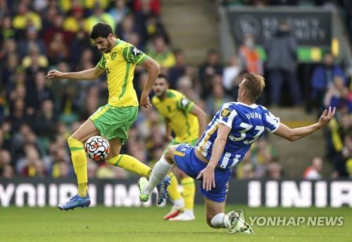 Norwich City's Pierre Lees-Melou, left and Brighton and Hove Albion's Dan Burn battle for the ball, during the English Premier League soccer match between Norwich and Brighton and Hove Albion, at Carrow Road, in Norwich, England, Saturday, Oct. 16, 2021. (Joe Giddens/PA via AP) UNITED KINGDOM OUT NO SALES NO ARCHIVE PHOTOGRAPH CANNOT BE STORED OR USED FOR MORE THAN 14 DAYS AFTER THE DAY OF TRANSMISSION
