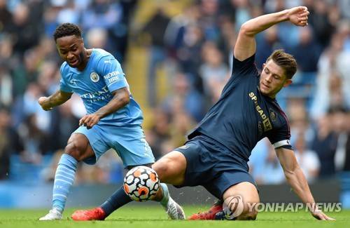 epa09527176 Raheem Sterling of Manchester City (L) in action with James Tarkowski of Burnley (R) during the English Premier League soccer match between Manchester City and Burnley in Manchester, Britain, 16 October 2021. EPA/PETER POWELL EDITORIAL USE ONLY. No use with unauthorized audio, video, data, fixture lists, club/league logos or 'live' services. Online in-match use limited to 120 images, no video emulation. No use in betting, games or single club/league/player publications