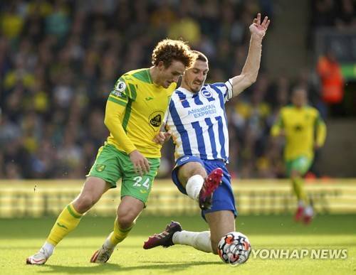 Norwich City's Josh Sargent, left and Brighton and Hove Albion's Lewis Dunk battle for the ball , during the English Premier League soccer match between Norwich and Brighton and Hove Albion, at Carrow Road, in Norwich, England, Saturday, Oct. 16, 2021. (Joe Giddens/PA via AP) UNITED KINGDOM OUT NO SALES NO ARCHIVE PHOTOGRAPH CANNOT BE STORED OR USED FOR MORE THAN 14 DAYS AFTER THE DAY OF TRANSMISSION