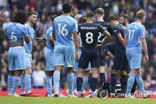 Burnley's Jack Cork checks on his teammate Burnley's Dwight McNeil, bottom, after a tackle by Manchester City's Aymeric Laporte, second left, during the English Premier League soccer match between Manchester City and Burnley at Etihad stadium in Manchester, England, Saturday, Oct. 16, 2021. (AP Photo/Jon Super)