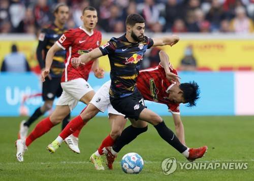 epa09527190 Freiburg's Jeong Woo-yeong (R) in action against Leipzig's Josko Gvardiol (L) during the German Bundesliga soccer match between SC Freiburg and RB Leipzig in Freiburg, Germany, 16 October 2021. EPA/RONALD WITTEK CONDITIONS - ATTENTION: The DFL regulations prohibit any use of photographs as image sequences and/or quasi-video.