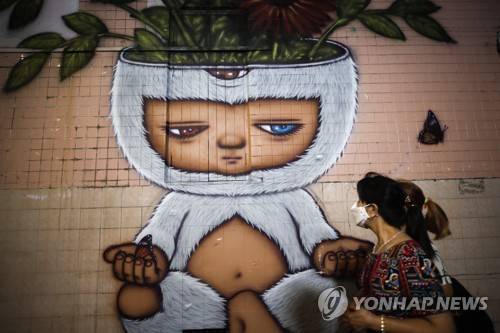 epa09527416 People walk past a wall decorated with graffiti along Khlong Ong Ang canal in Bangkok, Thailand, 16 October 2021. Thai Prime Minister Prayut Chan-o-cha announced on 11 October, that Thailand will fully reopen for vaccinated tourists from at least 10 low-risk countries without quarantine requirement from 01 November 2021, following the country's closure last year due to the coronavirus disease (COVID-19) pandemic. EPA/DIEGO AZUBEL