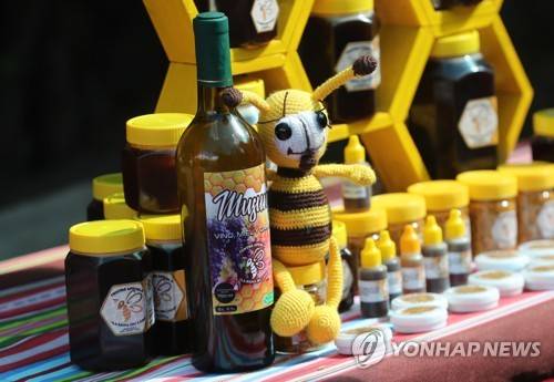 epa09527612 View honey bottles to sell of the center 'The queen of the lake' in San Pablo de Tiquina village, at the shore of Titicaca lake, Bolivia, 09 October 2021 (issued 16 October 2021). Beekeeper Wilder Humerez cultivates bee colonies 3,800 meters above sea level in the Titicaca lake. EPA/Martin Alipaz
