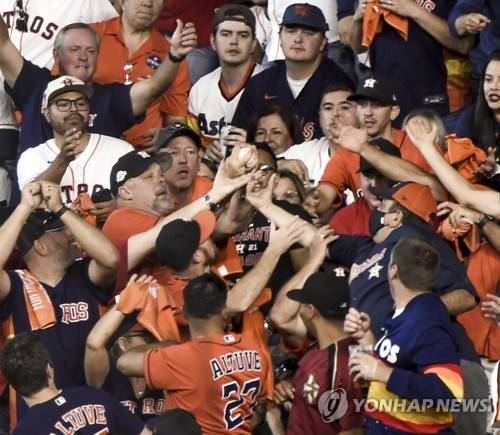 epa09527828 A fan catches a ball hit for a grand slam home run by Boston Red Sox designated hitter J.D. Martinez in the first inning of game two of the American League Championship Series between the Boston Red Sox and the Houston Astros at Minute Maid Park in Houston, Texas, USA, 16 October 2021. EPA/KEN MURRAY