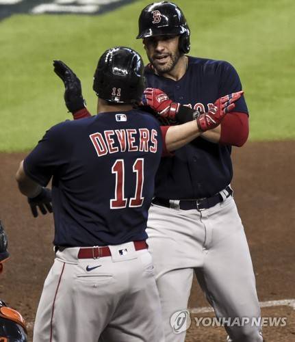 epa09527826 Boston Red Sox designated hitter J.D. Martinez (R) celebrates with Boston Red Sox third baseman Rafael Devers (L) after hitting a grand slam home run in the first inning of game two of the American League Championship Series between the Boston Red Sox and the Houston Astros at Minute Maid Park in Houston, Texas, USA, 16 October 2021. EPA/KEN MURRAY
