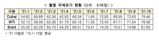 월별 국제유가 현황을 보면 WTI는 지난 1월 배럴당 52.1달러에서 3월 62.36달러, 5월 65.16달러, 7월 72.43달러로 꾸준한 오름세를 보였습니다. 8월에는 배럴당 67.71달러로 주춤했지만 9월 71.54달러로 다시 70달러대에 진입했습니다. 10월 1~12일 평균은 78.58달러에 달했습니다. 두바이유, 브렌트유도 10월 평균 배럴당 가격이 각각 79.46달러, 81.95달러를 기록했습니다.