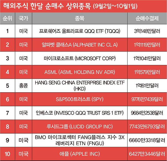 한국예탁결제원에 따르면 지난 9월 해외주식 투자자가 가장 많이 사들인 종목은 ‘프로셰어즈 울트라프로 QQQ ETF(TQQQ)’로 순매수액은 3억148만달러로 집계됐다. 해당 ETF는 나스닥100지수 등락에 따라 세 배의 수익 또는 손실이 나는 구조다.
