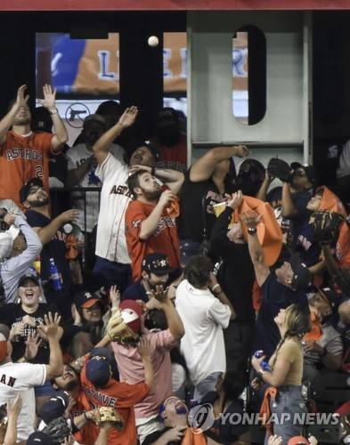 epa09527926 Fans watch a ball hit for a home run by Boston Red Sox center fielder Kike Hernandez in the fourth inning of game two of the American League Championship Series between the Boston Red Sox and the Houston Astros at Minute Maid Park in Houston, Texas, USA, 16 October 2021. EPA/KEN MURRAY