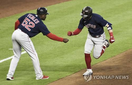 epa09527927 Boston Red Sox center fielder Kike Hernandez (R) celebrates with Boston Red Sox third base coach Carlos Febles (L) after hitting a home run in the fourth inning of game two of the American League Championship Series between the Boston Red Sox and the Houston Astros at Minute Maid Park in Houston, Texas, USA, 16 October 2021. EPA/KEN MURRAY
