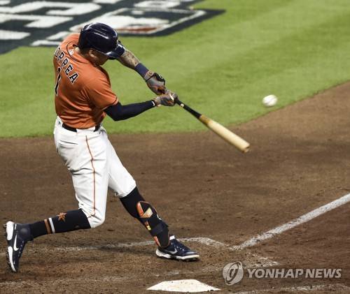 epa09527958 Houston Astros right fielder Kyle Tucker hits a two RBI double in the fourh inning of game two of the American League Championship Series between the Boston Red Sox and the Houston Astros at Minute Maid Park in Houston, Texas, USA, 16 October 2021. EPA/KEN MURRAY