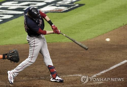epa09527973 Boston Red Sox designated hitter J.D. Martinez hits a single in the seventh inning of game two of the MLB American League Championship Series between the Boston Red Sox and the Houston Astros at Minute Maid Park in Houston, Texas, USA, 16 October 2021. EPA/KEN MURRAY