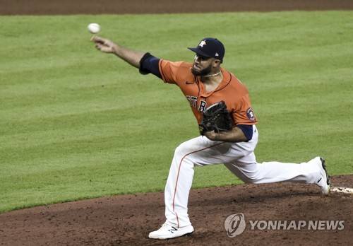 epa09527975 Houston Astros relief pitcher Yimi Garcia throws in the seventh inning of game two of the MLB American League Championship Series between the Boston Red Sox and the Houston Astros at Minute Maid Park in Houston, Texas, USA, 16 October 2021. EPA/KEN MURRAY