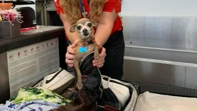 주인 부부의 여행 가방에 몰래 숨어든 반려견이 공항에서 발견돼 화제가 되고 있습니다.