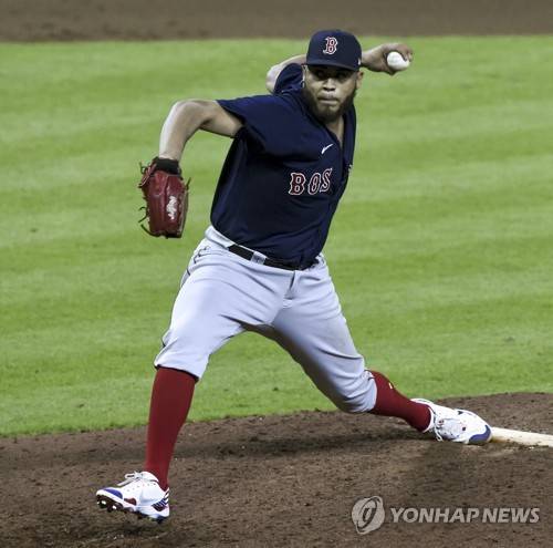 epa09528001 Boston Red Sox relief pitcher Darwinzon Hernandez throws in the ninth inning of game two of the MLB American League Championship Series between the Boston Red Sox and the Houston Astros at Minute Maid Park in Houston, Texas, USA, 16 October 2021. EPA/KEN MURRAY