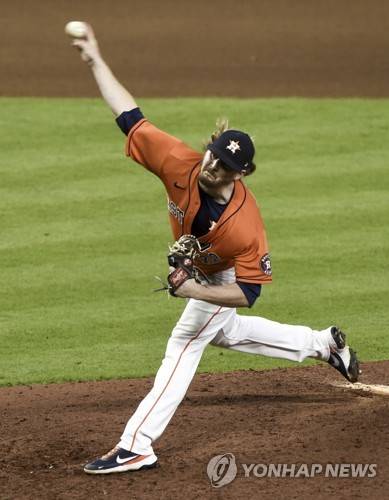 epa09528003 Houston Astros relief pitcher Ryne Stanek throws in the ninth inning of game two of the MLB American League Championship Series between the Boston Red Sox and the Houston Astros at Minute Maid Park in Houston, Texas, USA, 16 October 2021. EPA/KEN MURRAY