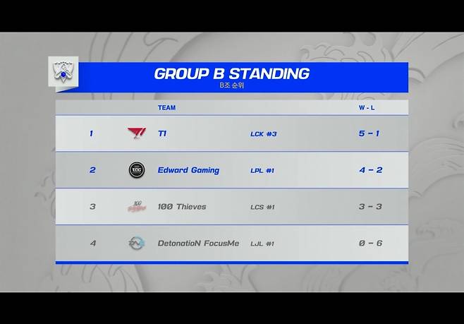 | ▲ B조 1위 기록한 T1 그룹스테이지 5일차 경기에서 T1이 EDG를 누르고 조1위로 8강에 진출했다. |