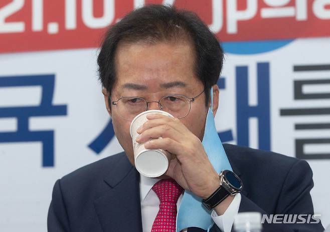 [서울=뉴시스] 국회사진기자단 = 홍준표 국민의힘 대선 경선 후보가 17일 오전 서울 여의도 홍준표 의원 사무실에서 열린 최 전 원장 영입 행사에서 물을 마시고 있다. 2021.10.17. photo@newsis.com