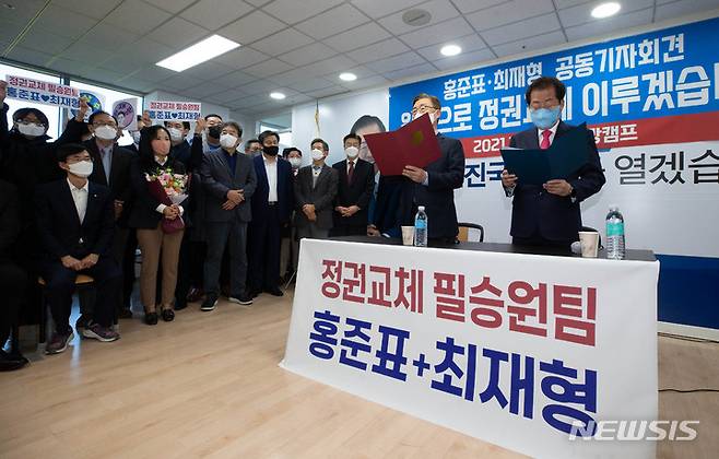 [서울=뉴시스] 국회사진기자단 = 최재형 전 감사원장과 홍준표(오른쪽) 국민의힘 대선 경선 후보가17일 오전 서울 여의도 홍준표 의원 사무실에서 열린 최 전 원장 영입 행사에서 공동 발표문을 낭독하고 있다. 2021.10.17. photo@newsis.com