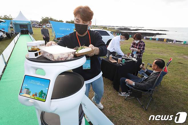 (서울=뉴스1) = 지난 15일 제주 김녕해수욕장 야영장에서 열린 '디지코캠핑 인 제주'에 참가한 가족들이 캠핑을 즐기고 있다. 디지코캠핑에 참가한 가족들은 비대면·비접촉 방식으로 KT의 AI, 빅데이터, 클라우드 기술을 체험하며 친환경 전기차 차박 캠핑을 즐겼다. (KT 제공) 2021.10.17/뉴스1