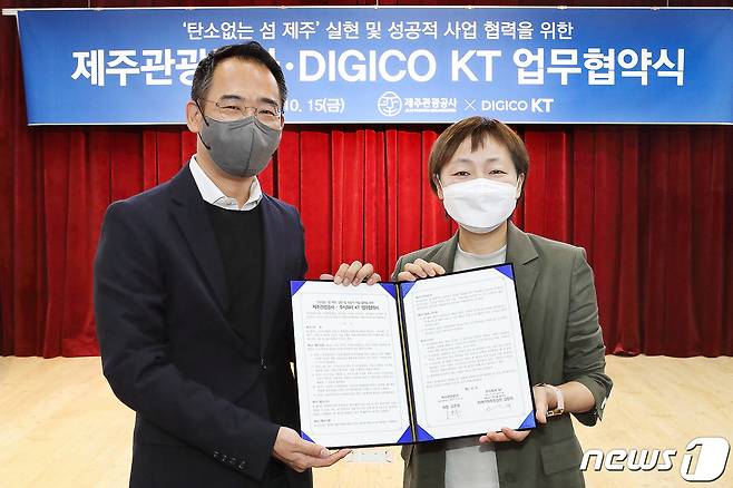 (서울=뉴스1) = 지난 15일 제주시 제주웰컴센터에서 열린 KT-제주관광공사 업무협약식에서 KT 미래가치추진실 기업이미지제고P-TF장 신훈주 상무(왼쪽)와, 제주관광공사 고은숙 사장(오른쪽)이 기념사진 촬영을 하고 있다. (KT 제공) 2021.10.17/뉴스1