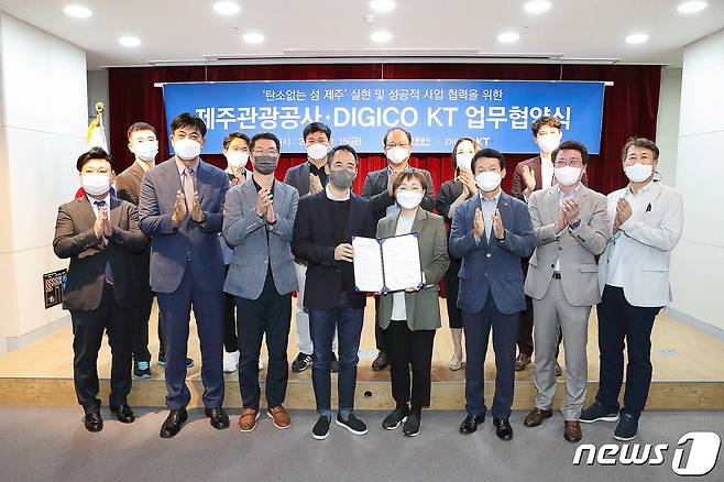 (서울=뉴스1) = 지난 15일 제주시 제주웰컴센터에서 열린 KT-제주관광공사 업무협약식에서 KT 미래가치추진실 기업이미지제고P-TF장 신훈주 상무(앞줄 왼쪽 네 번째)와, 제주관광공사 고은숙 사장을 비롯한 참석자들이 기념사진 촬영을 하고 있다. (KT 제공) 2021.10.17/뉴스1