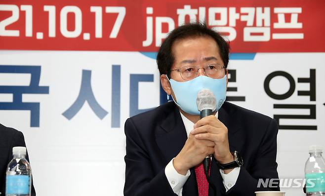 [서울=뉴시스] 국회사진기자단 = 홍준표 국민의힘 대선 경선 후보가 17일 오전 서울 여의도 캠프 사무실에서 열린 '최재형 전 감사원장 영입행사' 기자회견에서 기자들의 질문에 답변하고 있다. 2021.10.17. photo@newsis.com