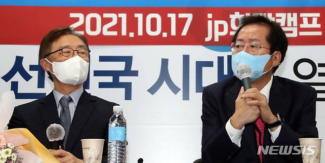 [서울=뉴시스] 국회사진기자단 = 홍준표(오른쪽) 국민의힘 대선 경선 후보가 17일 오전 서울 여의도 캠프 사무실에서 열린 '최재형 전 감사원장 영입행사' 기자회견에서 기자들의 질문에 답변하고 있다. 2021.10.17. photo@newsis.com