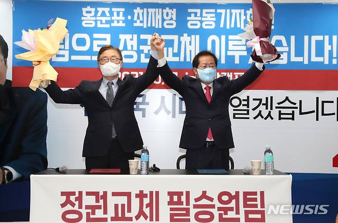[서울=뉴시스] 국회사진기자단 = 홍준표(오른쪽) 국민의힘 대선 경선 후보와 최재형 전 감사원장이 17일 오전 서울 여의도 홍 후보 캠프 사무실에서 열린 '최재형 전 감사원장 영입 행사 기자회견'에서 꽃을 들어 지지자들에게 인사하고 있다. 2021.10.17. photo@newsis.com
