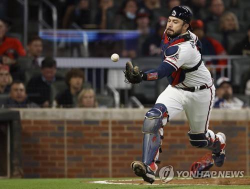 epa09528034 Atlanta Braves catcher Travis d'Arnaud can't catch a foul pop off the bat of Los Angeles Dodgers batter Albert Pujols in the top of the sixth inning of game 1 of the MLB National League Championship Series playoff baseball game between the Los Angeles Dodgers and the Atlanta Braves at Truist Park in Atlanta, Georgia, USA, 16 October 2021. EPA/ERIK S. LESSER