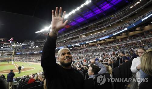 epa09528040 Atlanta United player Josef Martinez waves to fans as he watches in the sixth inning of game 1 of the MLB National League Championship Series playoff baseball game between the Los Angeles Dodgers and the Atlanta Braves at Truist Park in Atlanta, Georgia, USA, 16 October 2021. EPA/BRANDEN CAMP