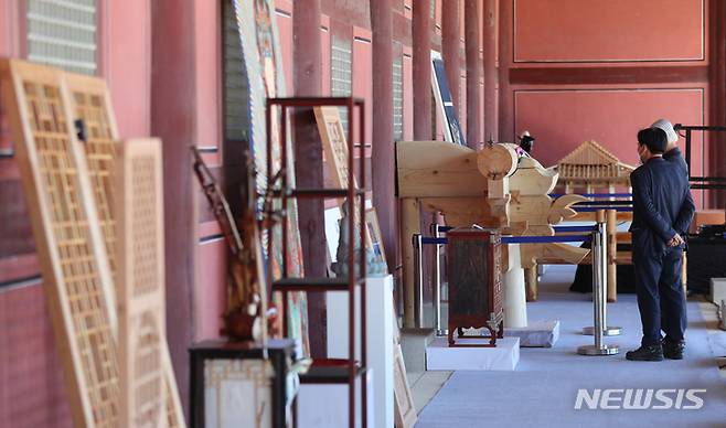 [서울=뉴시스] 배훈식 기자 = 제16회 한국문화재기능인작품전이 열린 17일 오전 서울 종로구 경복궁을 찾은 시민들이 전시물 관람을 하고 있다. 2021.10.17. dahora83@newsis.com