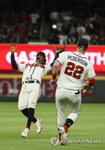 epa09528070 Atlanta Braves second baseman Ozzie Albies (L) catches a pop-up in front of teammate Joc Pederson (R) off the bat of Los Angeles Dodgers batter Albert Pujols in the top of the ninth inning of game 1 of the MLB National League Championship Series playoff baseball game between the Los Angeles Dodgers and the Atlanta Braves at Truist Park in Atlanta, Georgia, USA, 16 October 2021. EPA/ERIK S. LESSER